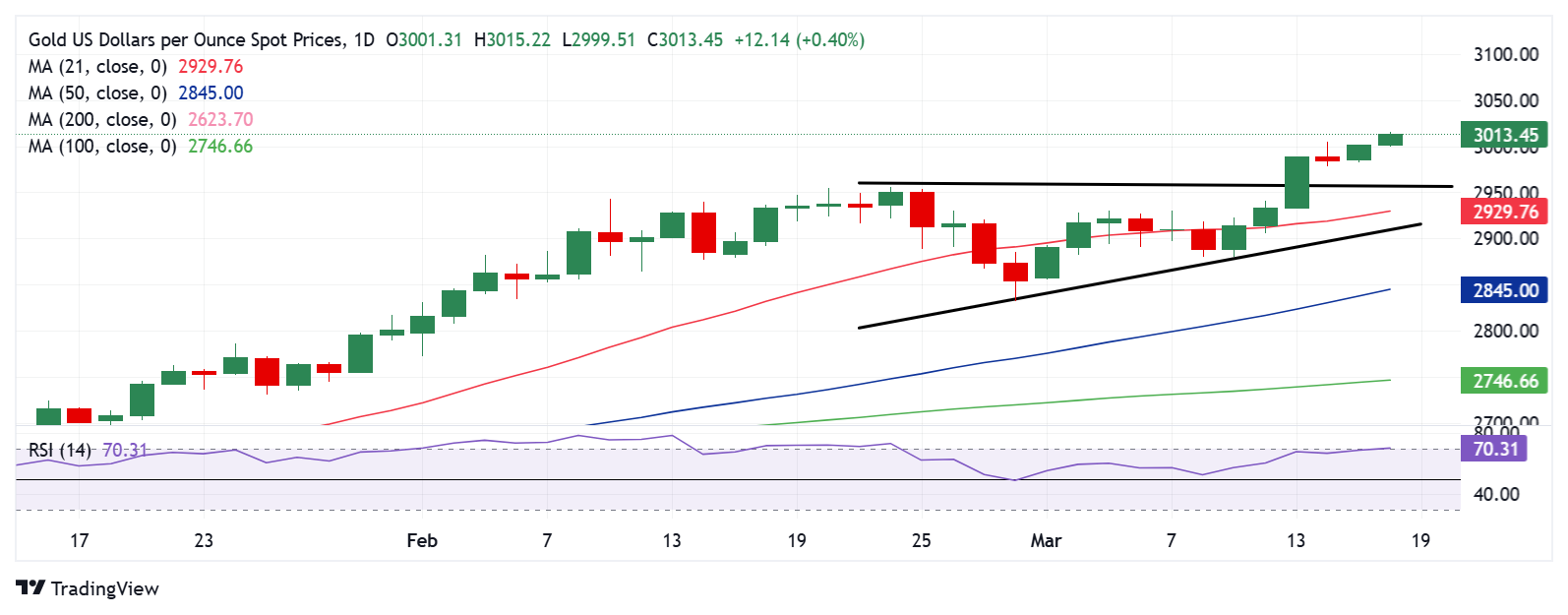 随着中东紧张局势加剧,黄金价格稳坐逾3000美元的历史高位。由于地缘政治风险压过经济不确定性,美元也受到避风港需求的影响。黄金价格在每日技术面保持看涨的情况下,仍有进一步上涨的空间...