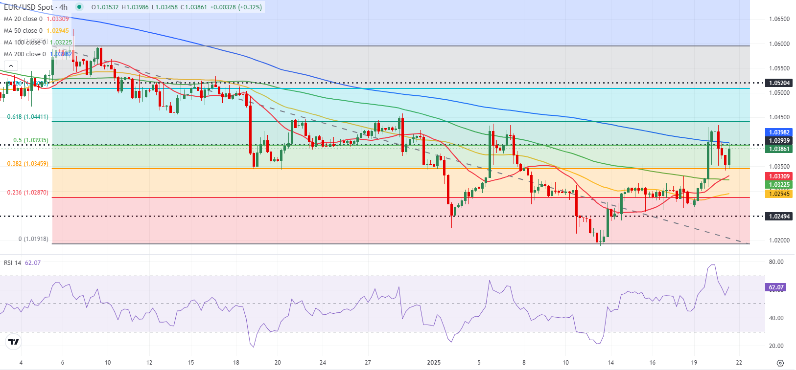 欧元/美元在欧洲交易时段出现下跌后,反弹至1.0400附近。技术展望显示短期内存在看涨倾向。风险情绪的改善使美元难以保持强势。