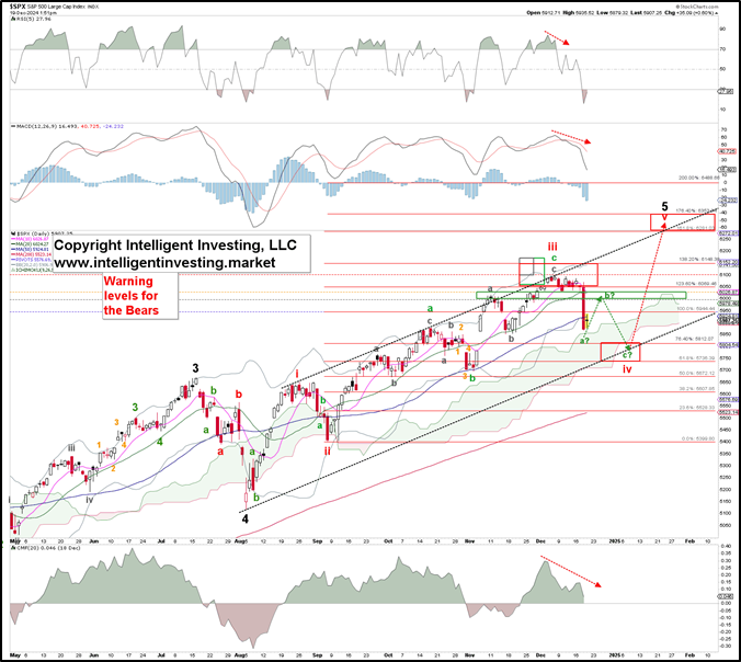 昨天,美联储预测2025年仅会有两次降息,导致市场迎来了我们五周前就已预期的调整。具体来说,利用艾略特波动理论(EW)分析标普500指数(SPX),五周前我们曾指出: