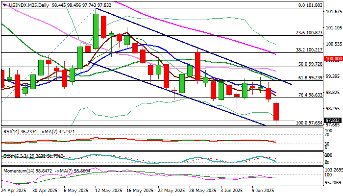 美元指数连续第二天坚挺在红色区域,因美联储降息的预期增加(由于5月份通胀低于预期)以及对关税纷争的持续不确定性,面临更大压力。