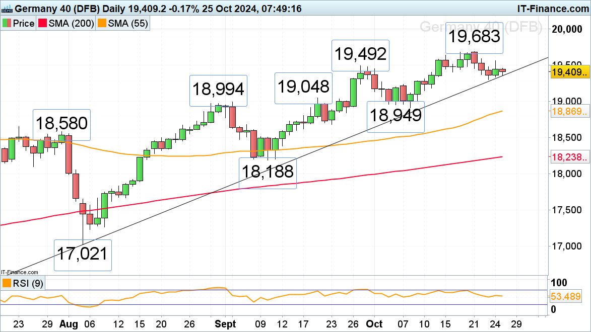 DAX 40 从周一的最新纪录高点19,683回落,并跌破了9月底19,492的峰值,本周将迎来三个星期以来的首次周线下跌。