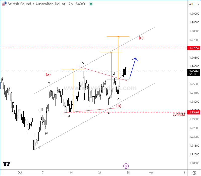英镑澳元汇对现在正在突破预期的看涨abcde感兴趣的跑步三角形态。由于突破了三角形,这意味着它正在突破b浪进入纠正性恢复的c浪,但在找到阻力前还有约1.97区域的上升空间。